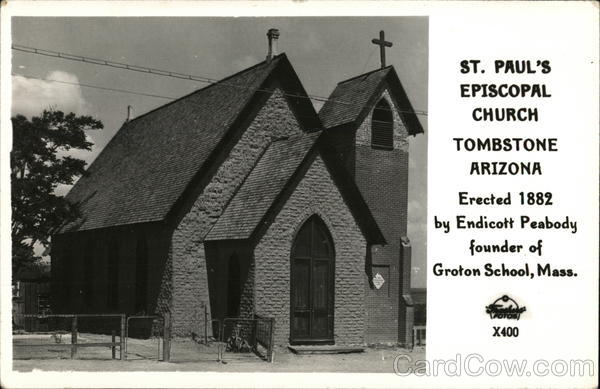 Front: ST. PAUL'S EPISCOPAL CHURCH TOMBSTONE ARIZONA Erected 1882 by Endicott Peabody founder of Groton School, Mass. FOTOS) X400 Back: EK LOLLESGARD SPECIALTY CO., TUCSON, ARIZONA