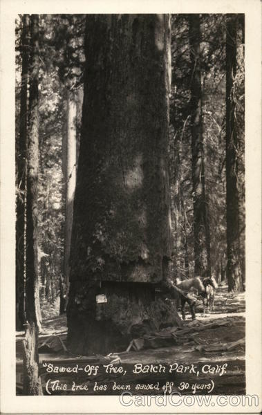 Front: "Sawed-Off Tree, Balch Park, Calif (This tree has been sawed off 30 years) Back: HAMMOND'S STUDIO "THE PHOTOGRAPHER IN YOUR TOWN" PORTERVILLE, CALIFORNIA 2 STAMP <NO <NO
