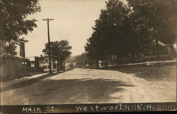 Front: Main St. DE Wentworth N.H. Back: SFP POST CARD 19 y a lovely time rowing fat Wouldn't come home but I'm afraid filley would sweetheart. nother swiething. ve means Re Raymond Jordan 25 Wilson Are 21 STAGE Waverler. m