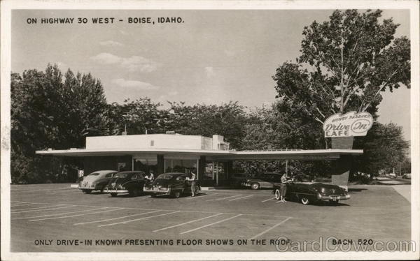 Front: ON HIGHWAY 30 WEST - BOISE, IDAHO. OK ONLY DRIVE-IN KNOWN PRESENTING FLOOR SHOWS ON THE ROOF. HOWDY PARDWER Drive On CAFE SOUVENIRS 26 BACH 520 Back: OUPONT PRODUCTS