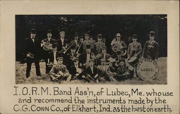 Front: BAND COBS COOK ASSN. LUBEC. PIBE NO 80. I.O.R.M. Band Ass'n, of Lubec, Me. who use and recommend the instruments made by the C.G.CONN Co., of Elkhart, Ind.as the best on earth. Back: NAME AND ADDRESS HERE