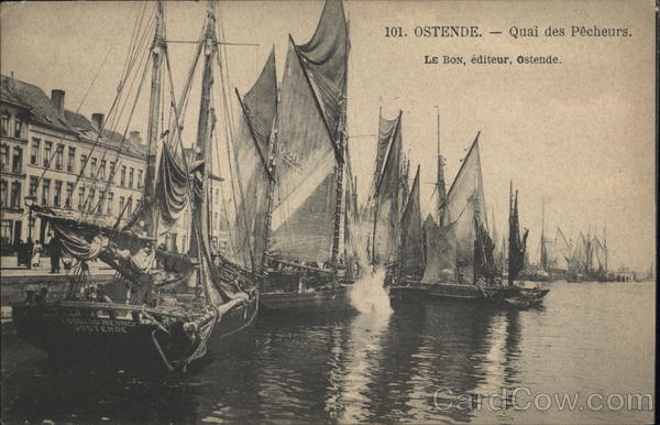 Front: VEILMARER-VOWER SALMAKER STAVINET HESREKILLIE DOUARD NIERINGK OOSTENDE 0.204 101. OSTENDE. - Quai des PĂȘcheurs. LE BON, Ă©diteur, Ostende. Back: -- *******GOD
