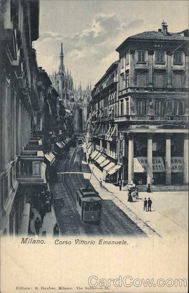 Front: Milano. Corso Vittorio Emanuele. Editore: R. Hauber, Milano. Via Solferino 33. ARM CIA ZA BETTI ARMI AMBE Back: CARTOLINA POSTALE. CARTE-POSTALE. UNION POSTALE UNIVERSELLE. POSTKARTE.