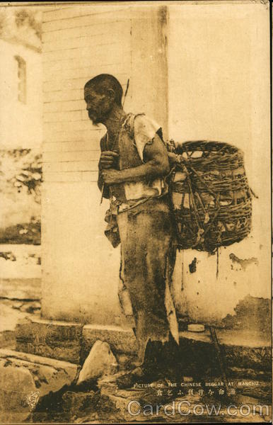 Front: PICTURE OF THE CHINESE BEGGAR AT MANCHU. 食乞ふ負背を命薄 Back: Made in Japan This Space may be used for Communication. Here