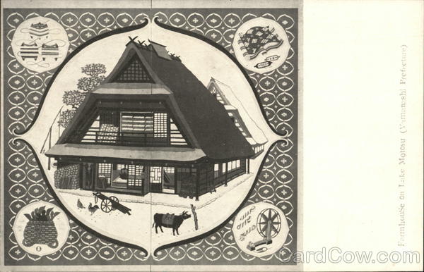 Front: 20 SMIR ** aire اور ان کی کمی کے go gl ge go gl 1||3 CIC *** FarmhouSe on Lake Motosu (Yamanashi Prefecture) 3g de gb Back: 郵便はがき Printed by MARIA-GABO, Kyoto, J: pan suor