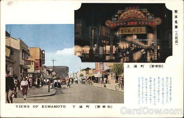 Front: VIEWS OF KUMAMOTO 下通町 (繁華街) 〇〇〇〇上通〇〇〇〇 手華甲玉堂へ 上通町 (繁華街) フギャン腹も立つみやバッテン ほんにシャンの居らすなら 好男に覚かれて 今潮も今朝とて田の味で シャンの漏らす村バッテン あのぶっち越すとしゃが たったと目でかバッテン 金したかベッテン会はんたい 自寺節 熊本名勝 (八枚組) Back: بو es 1952 Lamue 郵便はがき