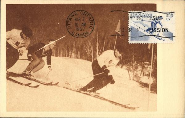 Front: OTTAW ONTARIO MAR 7 10 AM 1957 YUSSUE JOER DSSION 5ยข Back: SKIING IN CANADA First Day Cancellation Published by TULANE-Box 78. Station H- New York 25 Maximart Card