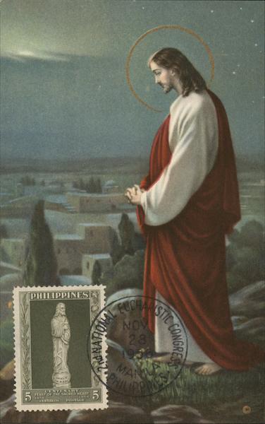 Front: PHILIPPINES CARVED BY DR.RIZAL ONAL FUCHA NOV 28 19 CENTENARY FEAST OF THE SACRED HEART 1856 1956 MAN STIC CONGRESS Back: First Bay Cancellation 0756 Copyright 1937 N. G. Basevi LITHO IN U. S. A. N. G. BASEVI INC.