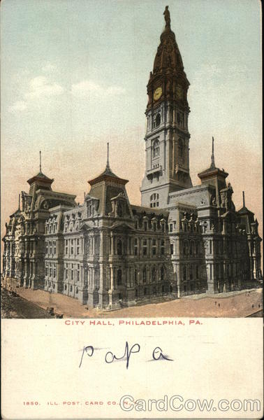 Front: EFE 論丽丽 HA IN CITY HALL, PHILADELPHIA, PA. papa 1850. ILL POST. CARD CO., N. Y. Back: PLACE POSTAGS DOMESTIC AND