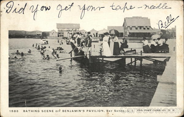 Front: Did you get your tape-needle Bell 1586 BATHING SCENE OFF BENJAMIN'S PAVILION, BAY SHORE, L. 1. Back: TATES OF ISL PLACE. PER UND EAST DOM 1905 ON FRANKLINT TE DSTAGE 906!1 - 3 Wds Miss Jennie & Brown Forestville می 2