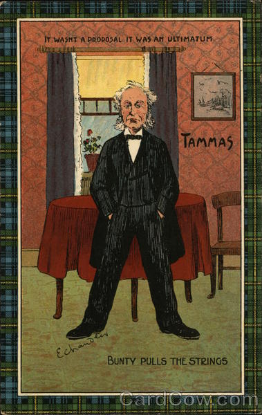 Front: SIS 104 SESSE IT WASHT A PROPOSAL IT WAS AN ULTIMATUM funt Laps Echandeer اليحيك TAMMAS BUNTY PULLS THE STRINGS Back: Correspondence. "NATIONAL" SERIES. TRADE MARK Made in Gt. Britain. No. 1890 CARD. Here.