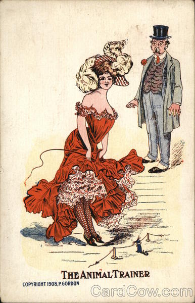 Front: CO COPYRIGHT 1908, P. GORDON cre ZUR Jay THE ANIMAL TRAINER W Back: ROLEUM POST CARD 8 1909 mabel Pribble bisks ms Ar Wra