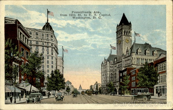 Pennsylvania Avenue is the most historic thoroughfare in America. Over it have passed funeral corteges of each of our martyred Presidents, and after the Civil War the entire Union Army marched through it to be reviewed by President Lincoln. It is the route of parade at each Presidential Inauguration, when thousands of citizens come from every state to partake in the Festivities. |