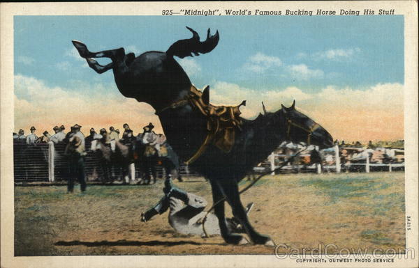 Midnight--World's Famous Bucking Horse Doing His Stuff "Midnight" for some years has been one of the famous horses of the world: renowned as the champion bucking horse and the leading attraction at the great rodeos. It is claimed he has never been ridden. |