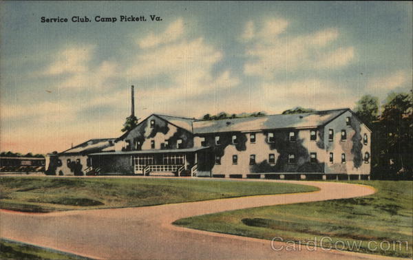 Front: Service Club. Camp Pickett, Va. 22 Back: From: 195 *TICHNOR QUALITY VIEWS Free to Service Men REG. U.S. PAT, OFF. posT CARE MADE ONLY BY TICHNOR BROS., INC., BOSTON, MASS. FOR VICTORY BUY WAR BONDS STAMPS 74141
