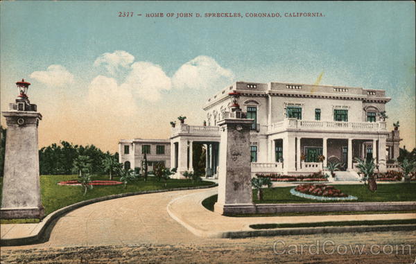 Front: O. 2377 HOME OF JOHN D. SPRECKLES, CORONADO, CALIFORNIA. XX XXXXX Back: MADE IN AMERICA BY EDW.H.MITCHELL AY SAN FRANCISCO.CALIFORNIA. THIS SPACE FOR ADDRESS ONLY