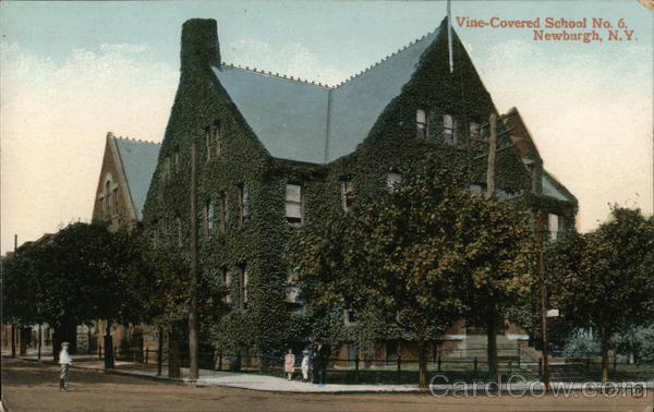 Front: Vine-Covered School No. 6, Newburgh, N.Y. 208,877 V Back: Sons Publishing Co., Ltd., New York Correspondence, FAMOUS V & SONS CARD. THROUGHOUT THE WORLD. Address Only.