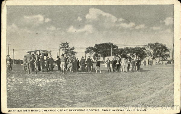 DRAFTED MEN BEING CHECKED OFF AT RECEIVING BOOTHS, CAMP DEVENS. AYER, MASS.