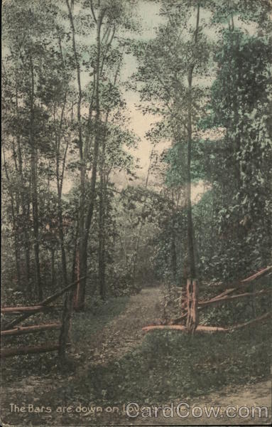 Front: The Bars are down on Lover's Lane, Greenport, L.I Back: Chug 281910 ch Itaving a fine time Sister 3. EE APOR AUG29 N.Y ONE CENTU 1910 Miss E. Eyth 224 Shippen. St موصل لال Weekacken Hats