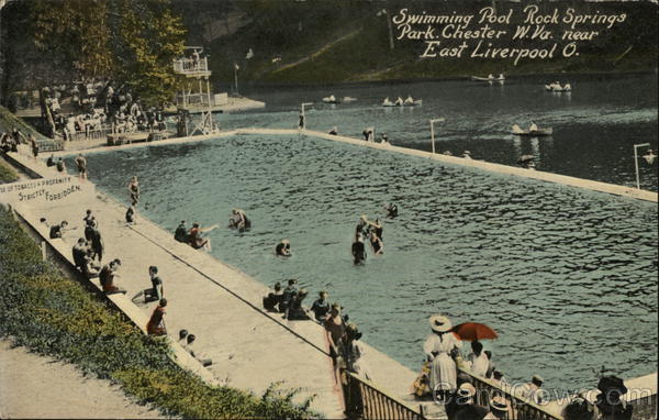 Front: SE OF TOBACCO * PROFANITY STRICTLY FORBIDDEN Tin Swimming Pool Rock Springs Park.Chester W.Va. near East Liverpool 0. Back: 12215 POST C bo Domestic and Two Cents