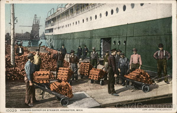 Front: AM 10029 LOADING COPPER ON STEAMER, HOUGHTON, MICH. COPR. DETROIT PUBLISHING CO. Back: "PHOSTINT" CARD. TRADE MARK REG. U. S. PAT. OFF. MADE ONLY BY DETROIT PUBLISHING CO. 50 AND CANADA. FOREIGN. TWO THIS SPACE MAY BE USED FOR MESSAGE. CENTS