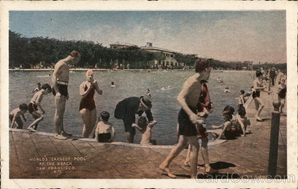 World's Largest Swimming Pool - World's largest outdoor swimming pool, and the scene of many local, regional and national aquatic sports events, is the ever-popular Fleishhacker Pool at San Francisco. Adjacent to Fleishhacker Zoo, the "Great Highway" and beach recreational area, the pool is served by the city's electric railway and bus system. |