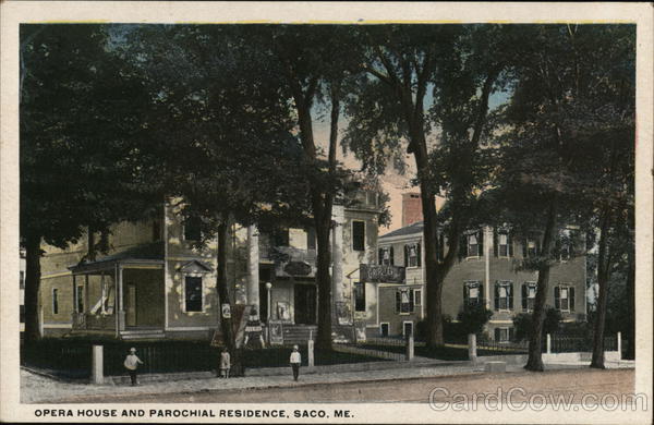 Front: OPERA HOUSE AND PAROCHIAL RESIDENCE, SACO, ME. GRIP SEVIL Back: Pub. by H. B. Kendrick & Co., Saco, Me. FOREIGN TWO THIS SPACE MAY BE USED FOR MESSAGE. CENTS.
