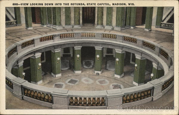 Front: 6085 VIEW LOOKING DOWN INTO THE ROTUNDA, STATE CAPITOL, MADISON, WIS. Back: 51388-E. A. BISHOP, PUBLISHER, RACINE, WIS. **