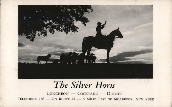 Front: KT X2 The Silver Horn LUNCHEON COCKTAILS DINNER TELEPHONE 736 - ON ROUTE 44 - 5 MILES EAST OF MILLBROOK, NEW YORK - Back: Etta's Birthday Aug/57 Celebrated الوصية