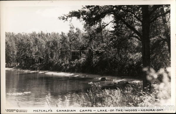 Front: LAKEWOOD STUDIO KENORA ONTARIO METCALF'S CAMPS LAKE-OF-THE-WOODS - KENORA-ONT. Back: MADE IN CANADA VELOX PLACE V X HERE X VELOX