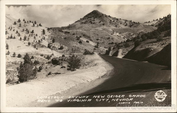 Front: COMSTOCK SKYWAY NEW GEIGER NEW GEIGER GRADE PENO TO VIRGINIA CITY, NEVADA CURTIS PHOTO aone Back: Pub. by Frasher's, Inc., Pomona, Calif. 1