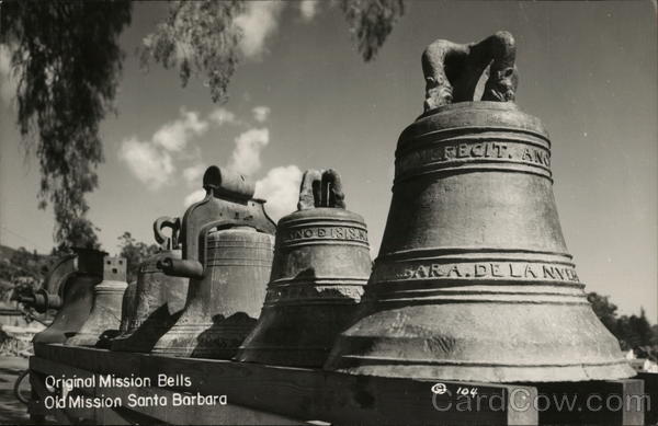 Front: Original Mission Bells Old Mission Santa Barbara NOD 1818.M MERECIT. ANG BARBARA.DE LANVER @ 104 Back: -Kodak-- L-Paper-- ANGELENO PHOTO SERVICE - 1030 SO. ALVARADO, L. A. 6, CALIF. PHOTO POST CARD