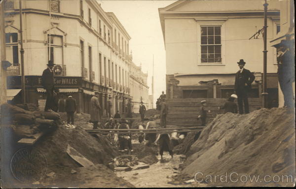 Men Standing Atop Dirt Piles Near Muddy Ditch in Street