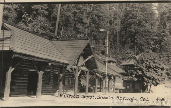 Front: SHASTA SPRINGS. SYYOTTE Railroad Depot, Shasta Springs, Cal 4696 Back: A AZO A AANO A 4696 Railroad depot, Sharta Springs, Cal.