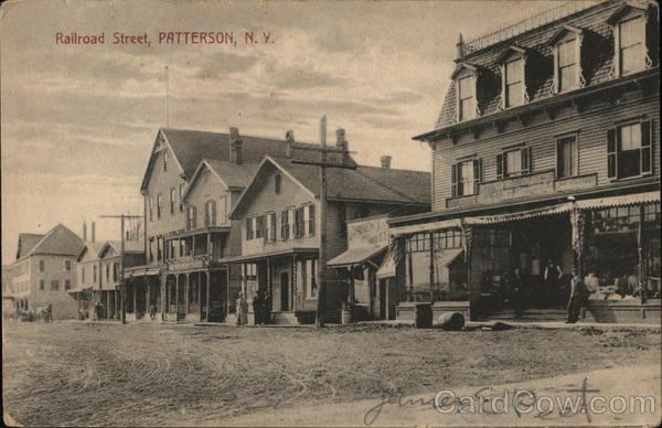 Front: Railroad Street, PATTERSON, N. Y. LV DRY GOODS Jumes & Pret Back: B 8501 Artino post cards, New York City. ARTINON This Space may be used for message. PLACK 1 CENT. 2 CENTS. Mis & Or Mosaman balcott Center ho F