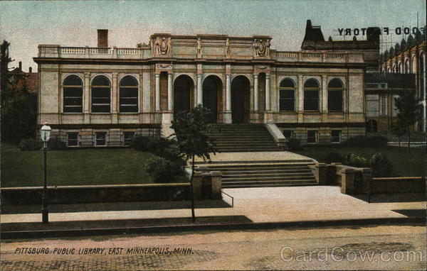 Front: La PITTSBURG PUBLIC LIBRARY, EAST MINNEAPOLIS, MINN. Steese УЯОТ 13 0003 10. Back: THE ROTOGRAPH Co.N.Y. CITY E 34054 Two CENTS