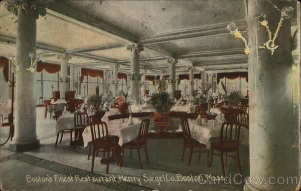 Front: CA Boston's Finest Restaurant Henry Siegel.Co., Boston, Mass. Back: .50 Brebon S AUG 4 Massot Dea 10 MASS Sir, please can you send us Mrs Burne we have company moregt of milk Vally use get to to every morning D24TTENT SAN Saugus Maso