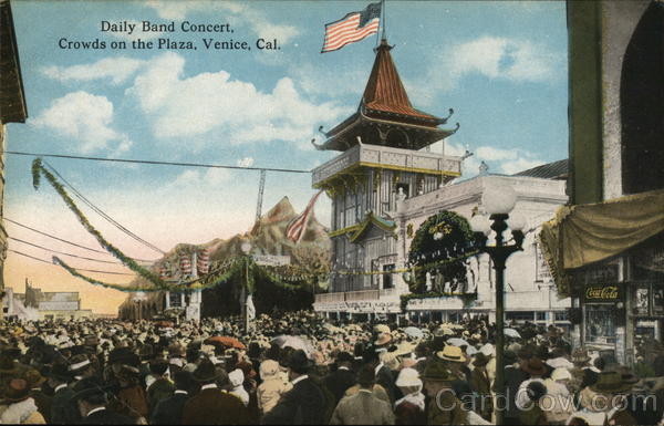 Front: Daily Band Concert, Crowds on the Plaza, Venice, Cal. PAUZA CAF ke M Coca-Cola ***8 Back: PUBLISHED BY THE VENICE DRUG CO., VENICE, CAL FOR WRITING MESSAGES. C.T. PHOTOCHROM. al A-69077 THIS SPACE FOR ADDRESS ONLY.
