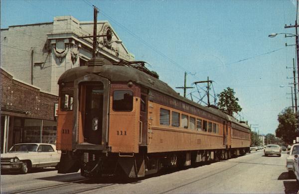Chicago, South Shore & South Bend 111 South Bend-Chicago train no, 320 pauses in front of the storefront station at Michigan City, Indiana, on the afternoon of August 10, 1969. The South Shore maintains a considerable amount of street running here. |