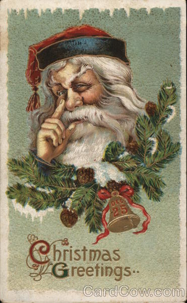 Front: DEC 25 Christmas Greetings.. Back: MADE IN USA 31F Ire sent livin unde albut came to see you is old Santa HERE