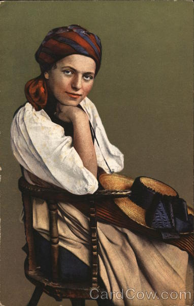 Woman Wearing Bandana Seated in Wooden Chair, Hat in Lap
