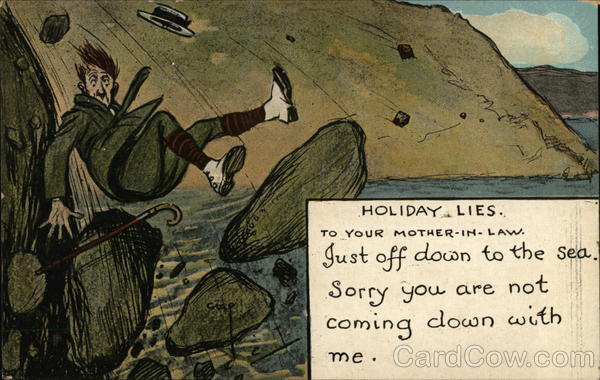 Front: GR DYO www. HOLIDAY LIES. TO YOUR MOTHER-IN-LAW. Just off down to the sea. Sorry you are not coming down with me. Back: Valentine's Series L. SOUVENIR POST GARD