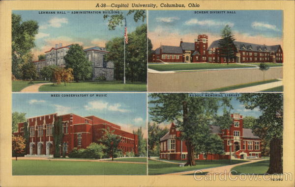 Front: A-38-Capital University, Columbus, Ohio LEHMANN HALL ADMINISTRATION BUILDING SCHENK DIVINITY HALL 登10 登 Bi31 五18 B tt81 MEES CONSERVATORY OF MUSIC RUDOLF MEMORIAL LIBRARY 1B-H80 Back: W. E. AYRES, 1049 LIVINGSTON AVE., COLUMBUS, OHIO