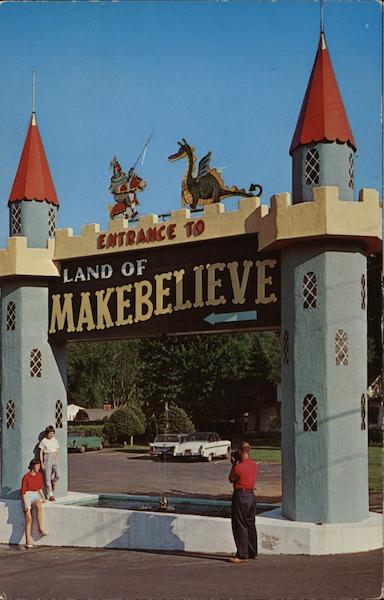 Front: ENTRANCE TO LAND OF MAKEBELIEVER Back: LIND OF MIKERELIIVE Fountain at Entrance to Colorful Land of Makebelieve. Route 9N Upper Jay, N. Y. 55956-B Pub. by Dean Color Service, Glens Falls, N. Y. WEST NYACK, N.Y. * 3.- HERE