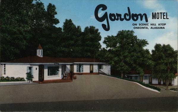 Front: OFFICE CECE (EEB Gordon B ON SCENIC HILL ATOP ONEONTA, ALABAMA **** Back: GORDON U. S. Hiway No. 231 Oneonta, Ala. New and Modern - Air Conditioned Tile Baths - Tub & Shower T. V. In Rooms 38,476F Pub. by The Vernon Company, Newton, lowa HERE