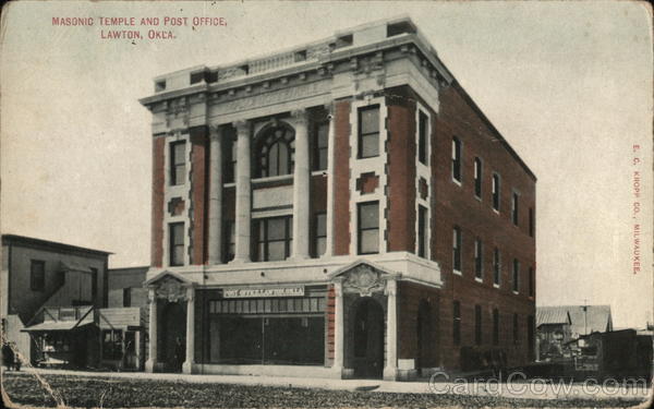 Front: MASONIC TEMPLE AND POST OFFICE, LAWTON, OKLA. POST OFFICE LAWTON OKLA ER 111 100 E. C. KROPP CO., MILWAUKEE. Back: Post Gard IS. POS- SESSIONS ic CAN A DIAN MEXICAN HAND-COLORED. 2c