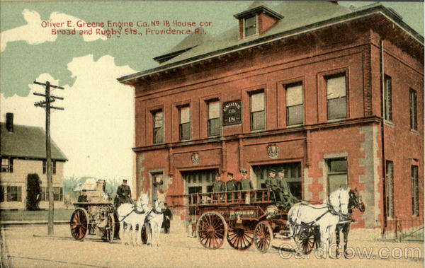 | No. 18 House Cor. Broad and Rugby Sts. Second size Metropolitan Piston Engine, built in 1906. Diameter of pumps, 4 3/4 -in.; steam - cylinder, 8 -in.; stroke, 8 -in. Drawn by two horses, is fitted with rubber tires and weighs, ready for service, 8,500 lbs. Placed in service July 17, 1906. Also Steam-frame Combination wagon, built 1865. Drawn by two horses, and carries 800 ft. of 2 1/2 -in. hose and 200 ft. of 3/4 -in. hose. Is equipped with 50-gal. tank and weighs, rady for service, 4,940 lbs. Placed in service Nov. 30, 1895. Company consists of 1 Capt., 1 Lieut., 3 Hose-men, 1 Engine-Man, 1 Asst. Engine-man, 1 Hose Driver and 1 Engine-Driver. |