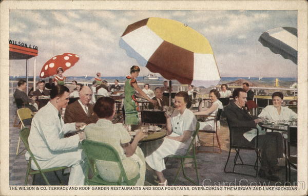THE WILSON & CO. TERRACE AND ROOF GARDEN RESTAURANTS AND SODA FOUNTAINS, OVERLOOKING THE MIDWAY AND LAKE MICHIGAN