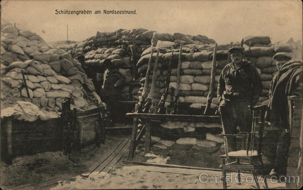 Front: Schützengraben am Nordseestrand. Back: 2108 Nr. Milltärisch zensiert und zum frelen Verkehr zugelassen. Kunst- und Verlagsanstalt Schaar & Dathe, K.-G. a. Akt., Trier.