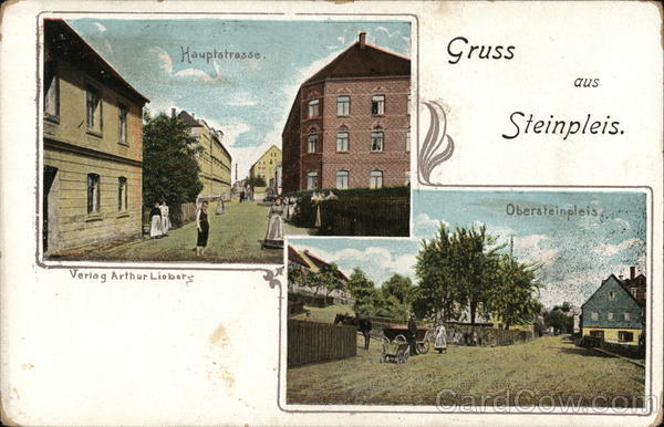 Front: Hauptstrasse. Verlag Arthur Liebers 77 Gruss aus Steinpleis. Obersteinpleis 11 Back: Poſtkarte. Raum für Mitteilungen, nur für's Inland.) (Nur für Adreſſe.)